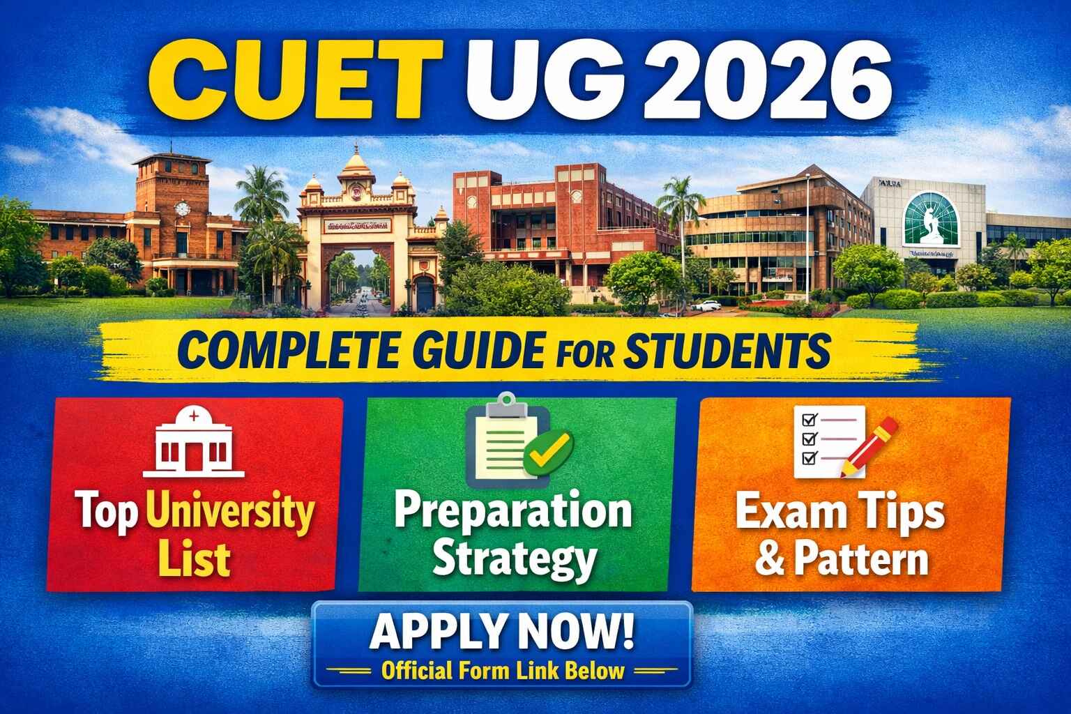 If you are preparing for CUET UG 2026, this guide will help you understand everything in one place — including participating universities, preparation tips, subject-wise study planning, exam pattern, and the official application process.